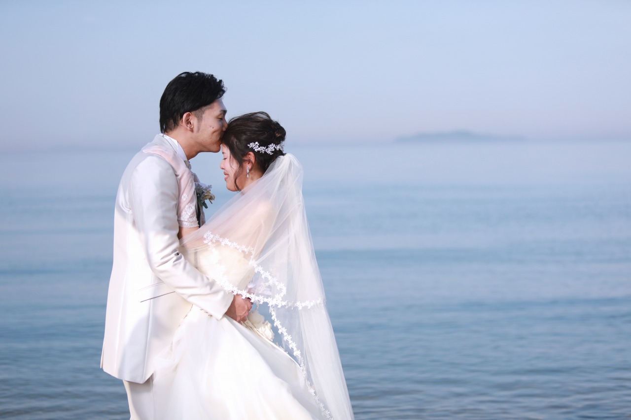 弧を描く長く続く砂浜と海の景観が美しい憩のビーチ、癒しのビーチ、織田ヶ浜。空は高く青く、太陽の光に輝く青い海。え…?ココは日本?と思うような自然の美しさが際立ち、ナチュラルなビーチウェディングフォトが撮れます。ケーオー宮殿が背景に見える位置でのショットも素敵です。近くのエリアのソテツの景観の中でのウェディングフォトも楽しめます。